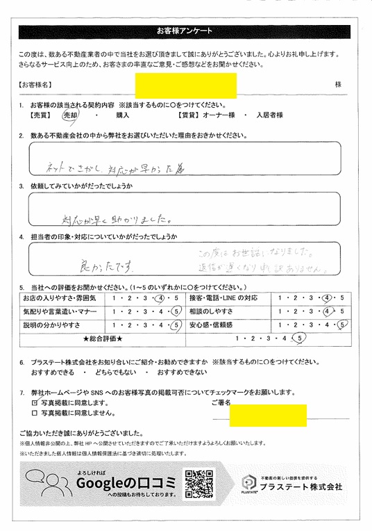 長崎市さくらの里 K様(売却) 対応が早く助かりました。 サービス評価★総合評価★★★★★★お店の入りやすさ・雰囲気★★★★気配りや言葉遣い・マナー ★★★★★★説明の分かりやすさ★★★★★接客・電話・LINEの対応★★★★相談のしやすさ★★★★安心感・信頼感★★★★★ Qお客さまの該当されるご契約内容A (売買)売却 Q数ある不動産会社の中から弊社をお選びになった理由A ネットでさがし、対応が早かった為 お客さまアンケー