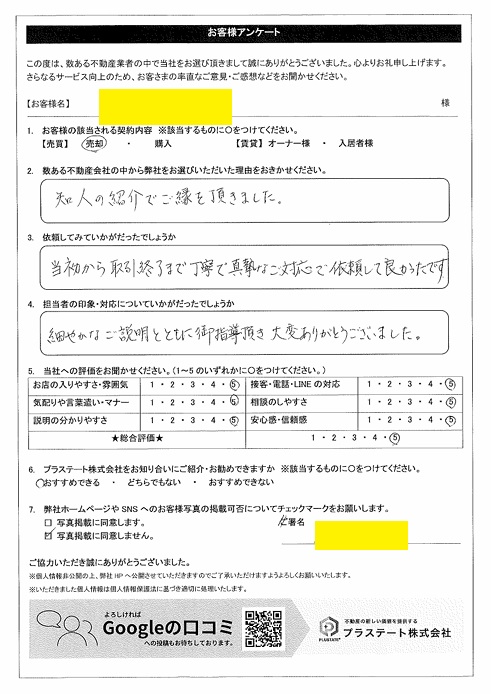 長崎市中里町 Y様(売却) 当初から取引終了まで丁寧で真摯なご対応で依頼して良かったです。 サービス評価★総合評価★★★★★★お店の入りやすさ・雰囲気★★★★★気配りや言葉遣い・マナー★★★★★説明の分かりやすさ★★★★★接客・電話・LINEの対応★★★★★相談のしやすさ★★★★★安心感・信頼感★★★★★ Qお客さまの該当されるご契約内容A (売買)売却 Q数ある不動産会社の中から弊社をお選びになった理由A 知人の紹介でご縁を頂きました。 お客さまアンケー