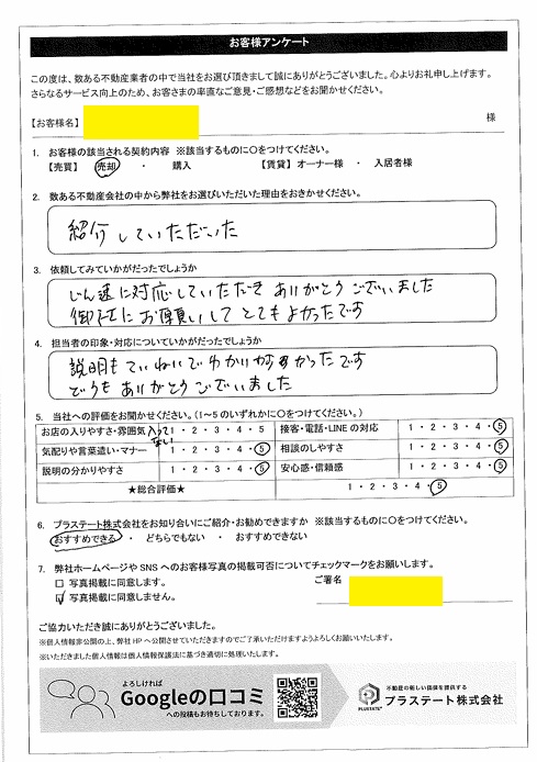 長崎市晴海台 T様(売却) 迅速に対応していただきありがとうございました。御社にお願いしてとても良かったです。 サービス評価★総合評価★★★★★★お店の入りやすさ・雰囲気来店なし気配りや言葉遣い・マナー★★★★★説明の分かりやすさ★★★★★接客・電話・LINEの対応★★★★★相談のしやすさ★★★★★安心感・信頼感★★★★★ Qお客さまの該当されるご契約内容A (売買)売却 Q数ある不動産会社の中から弊社をお選びになった理由A 紹介していただいた お客さまアンケー