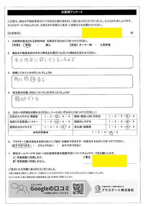 長崎市田中町 H様(売却) 親切でした サービス評価★総合評価★★★★★お店の入りやすさ・雰囲気★★★気配りや言葉遣い・マナー★★★説明の分かりやすさ★★★★接客・電話・LINEの対応★★★★相談のしやすさ★★★★安心感・信頼感★★★★ Qお客さまの該当されるご契約内容A (売買)売却 Q数ある不動産会社の中から弊社をお選びになった理由A 矢上地区に詳しそうだったので お客さまアンケー