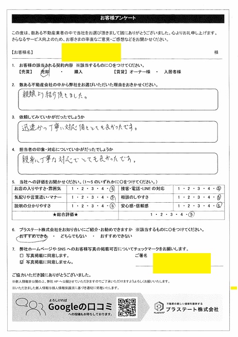 長崎市音無町 H様(売却) 迅速かつ丁寧に対応頂きとても良かったです。 サービス評価★総合評価★★★★★★お店の入りやすさ・雰囲気★★★★★気配りや言葉遣い・マナー ★★★★★★説明の分かりやすさ★★★★★接客・電話・LINEの対応★★★★★相談のしやすさ★★★★★安心感・信頼感★★★★★ Qお客さまの該当されるご契約内容A (売買)売却 Q数ある不動産会社の中から弊社をお選びになった理由A 親類より紹介頂きました。 お客さまアンケー
